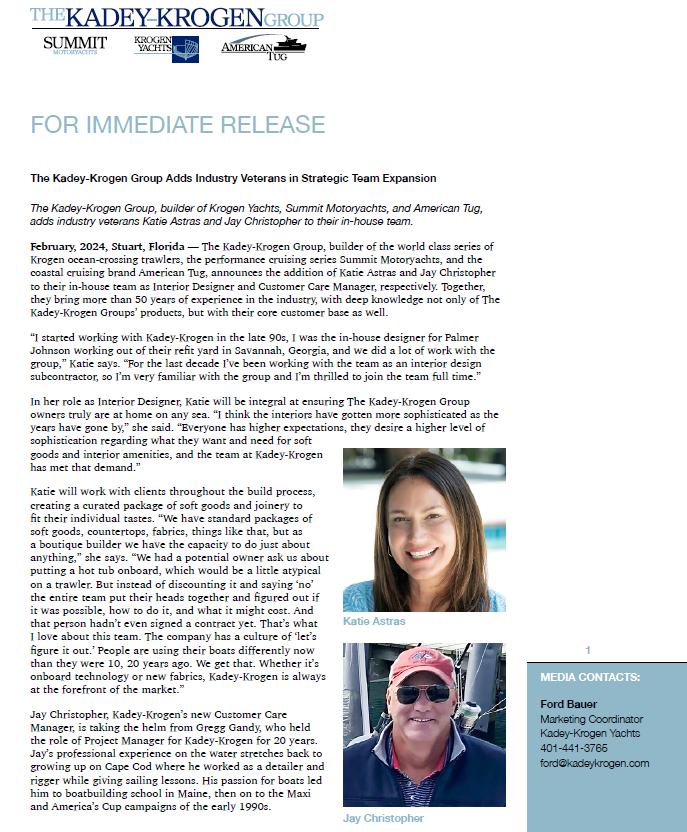 The Kadey-Krogen Group, builder of Krogen Yachts, Summit Motoryachts, and American Tug,adds industry veterans Katie Astras and Jay Christopher to their in-house team.