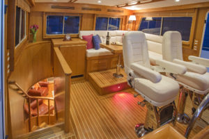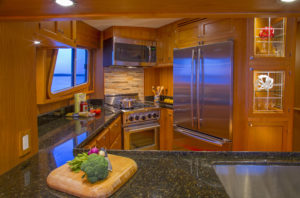One way the Kadey-Krogen design capitalizes on the space is to provide the kind of provisioning and stowage space needed for extended voyaging. After all, long-range cruising can mean there’s a self-sufficiency component to the planning. Efficient refrigeration and freezer systems, including full-size appliances like in a home kitchen mean the food stays fresh. Pantry space is easy to set up so the chef can find what’s needed without having to dig through the entire stockpile. Stowage for clothing and gear is readily accessible but also gets stuff out of the way. And the displacement hull does not have an adverse reaction to being laden with gear.