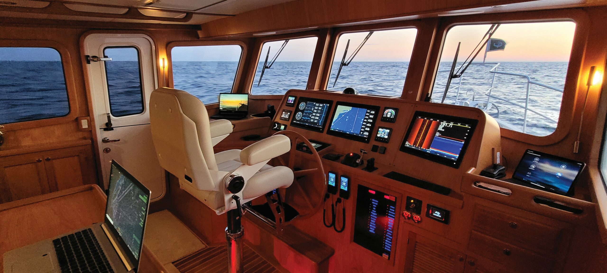 In addition, Jeff noted, “Our 360-amp alternator is controlled by a Wakespeed regulator, which is unique. When we’re underway, monitoring our energy system with the Garmin, we can actually see what the alternator is producing in the way of current. Say Ellen turns on the microwave in the salon. The Wakespeed essentially talks to the batteries and the alternator through a computer bus system, and it shares the responsibility of providing enough energy to these different loads when you’re bringing them online. If we want to run the A/C in the pilothouse, you can actually see the sharing of the energy between the lithium batteries and the alternator. What’s so cool is that it’s like a ballet dance. It resembles nothing like what we had on our 44.”