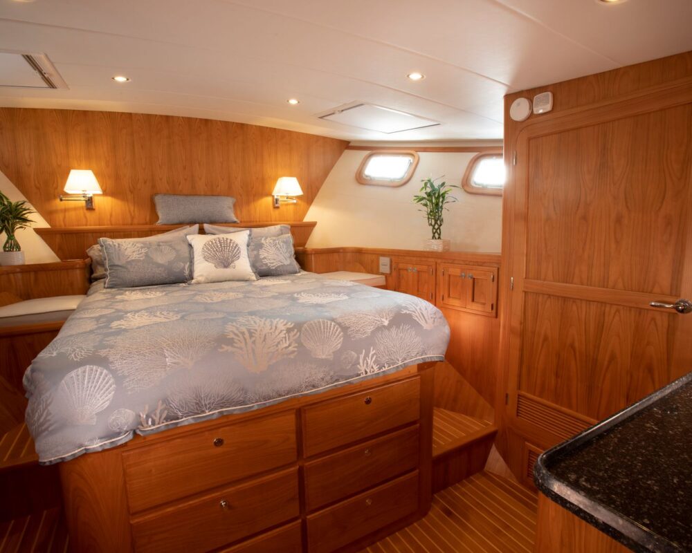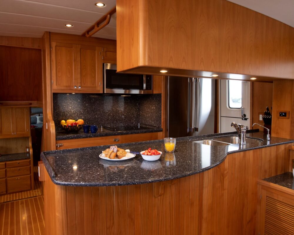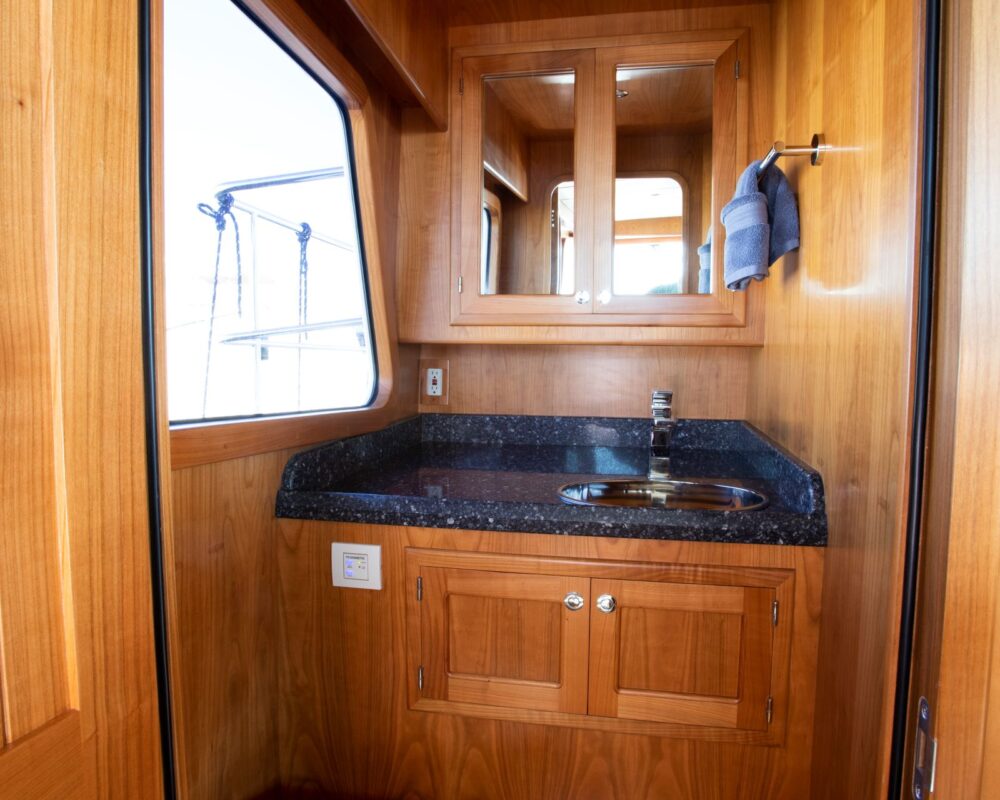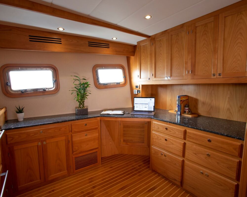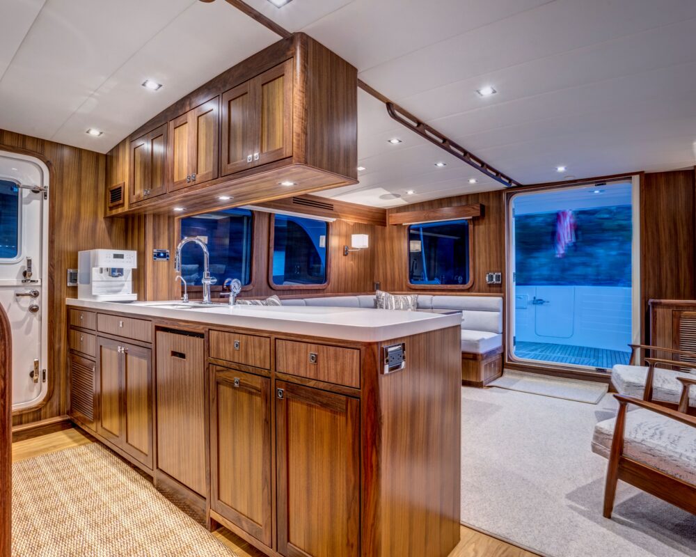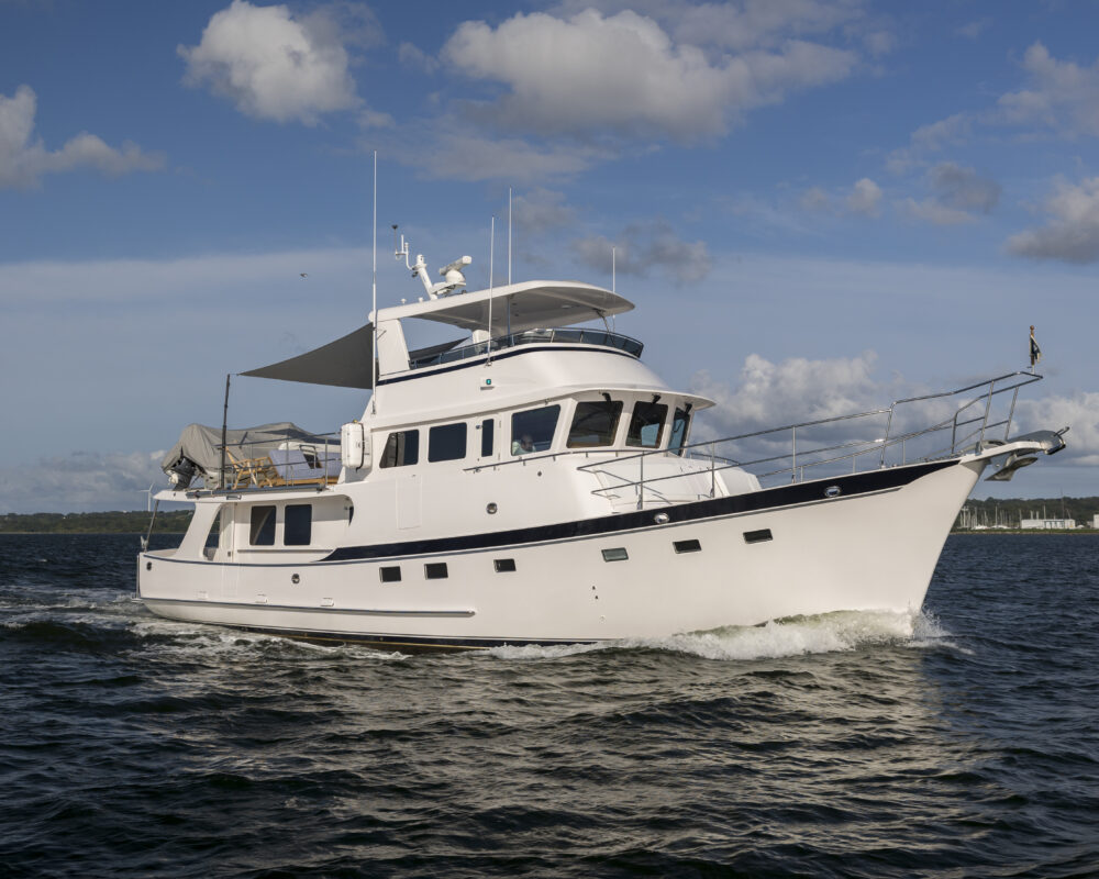 Like all Kadey-Krogen models, the 58 seamlessly blends design, systems, and comforts. And we don’t see these as autonomous endeavors. For example, on a passagemaker it is preferred that the living quarters that will see significant use while on passage are concentrated in the most comfortable portion of the boat should heavy weather be encountered. Note the location of the 58’s pilothouse and galley area. This also benefits the design and weight distribution allowing an easy motion into a head sea. The deep forefoot and rounded entry of the 58 ensure there is no pounding at all. It’s a soft, easy entry into even large seas.